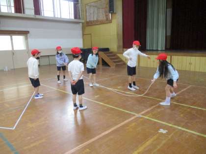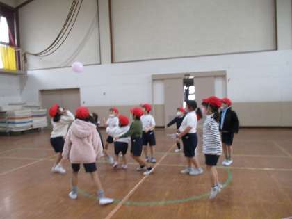 風船バレーは,2チームに分かれてやりました。みんな落とさないように風船を追いかけていました。大繩は郵便屋さんをし,頑張って飛ぼうとしていました。