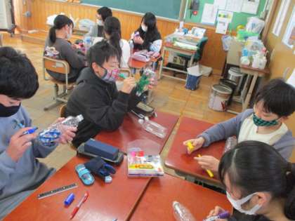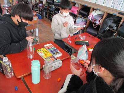 地域の方々が,一つ一つ丁寧にペットボトルに穴をあけてくださり,そのペットボトルに色を付けています。150周年を祝う思いを込めながらきれいに仕上げていました。