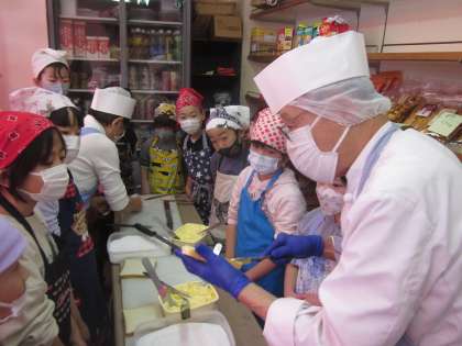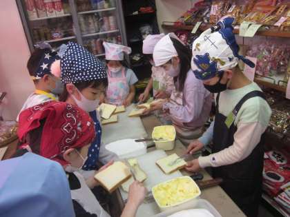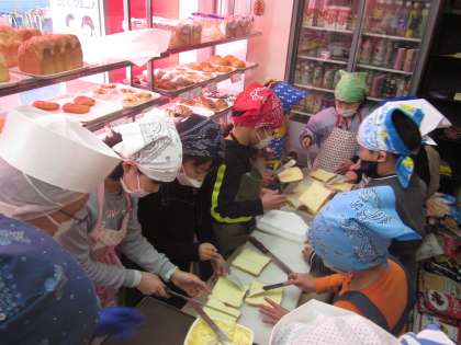 地域のパン屋さんで、ラスク作りの体験をさせていただきました。みんなこの日をとても楽しみにしていました。自分のエプロンと三角巾をつけると気分はパン屋さん。材料や道具,作り方の手順の説明をしっかりと聞いていたので,どの子もとても上手にできました。