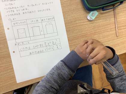 温度と物のかさの授業で,空気をあたためるとどうなるか,を学んでいます。