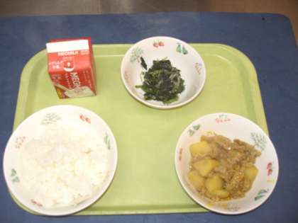 今日から給食が始まりました。今日の「肉じゃが」は牛肉ではなく、豚肉で作りました。カレー味なので子供たちにも人気があります。久しぶりの給食をみんな喜んで食べてくれました。