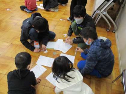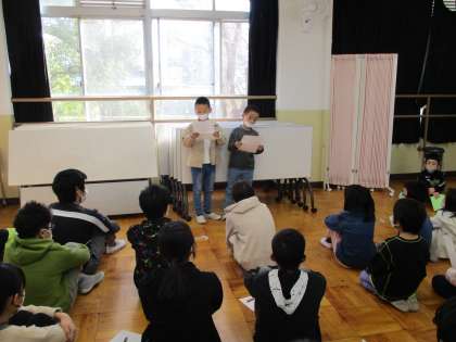 前半は、1年生からは3ヒントクイズ、6年生からはビンゴゲームをしました