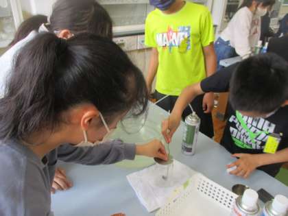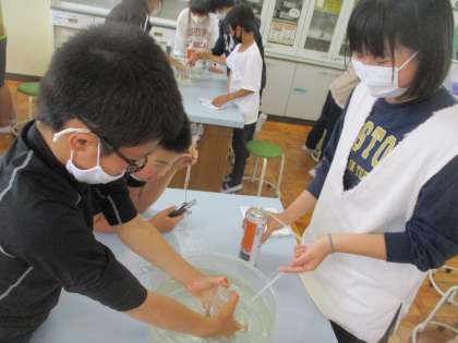 気体を集め,火のついたろうそくをそれぞれのびんの中に入れて,ろうそくの火がどうなるか,観察しました。グループで協力して取り組めていました。