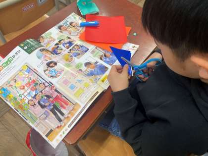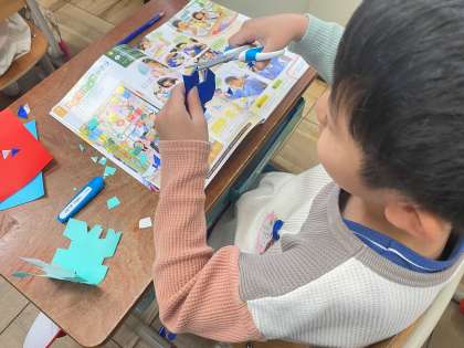 以前はみんなで同じものを作ったので,自分の好きなように作れると聞いて,思い思いにはさみで模様を作っていました。個性溢れる色々な形ができ,上手に工作していました。
