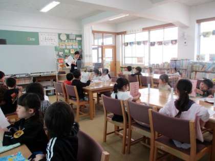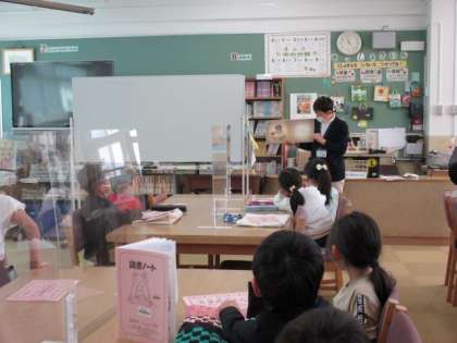 司書の先生に,図書館の使い方を教えてもらいました。本の借り方や返し方などを教えてもらい,司書の先生に絵本の読み聞かせもしてもらいました。「しゅくだい」という本を聞き,とても静かに聞けていました。