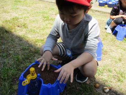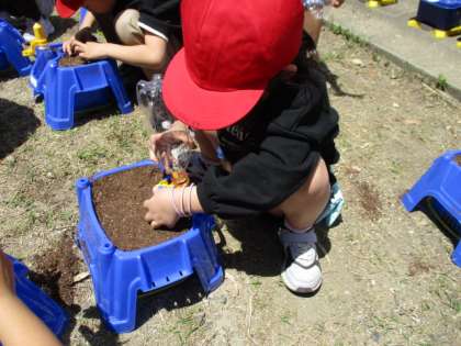 生活科の「さかせたいな わたしのはな」という学習で、朝顔の種をまきました。丁寧に土を鉢に入れて、「大きくなってね。」と言いながら、優しく種まきをしていました。これからどんなふうに成長するのか楽しみですね。