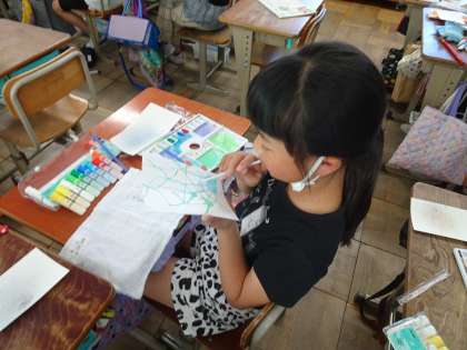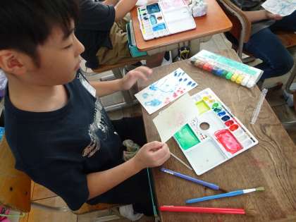 絵具のいろいろな使い方をためして模様づくりをしました。色を変えて線を重ねたり、絵具をストローでふいたりして楽しみました。思いもよらない面白い模様が作れて子どもたちは喜んでいました。