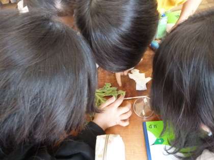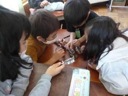 今日は理科で,モンシロチョウの幼虫を観察しました。2mmぐらいの小さなものから,2cm近くまで大きくなっている幼虫もいました。子どもたちは,幼虫の動き方を見て,「おもしろい」「かわいい」と言いながら,虫眼鏡も使ってじっくり見ていました。ここから,どんな風に成長していくのでしょうか・・・。