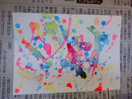 「ドリッピング」多めの水でといた絵の具を筆につけ、画用紙の上でふりました。