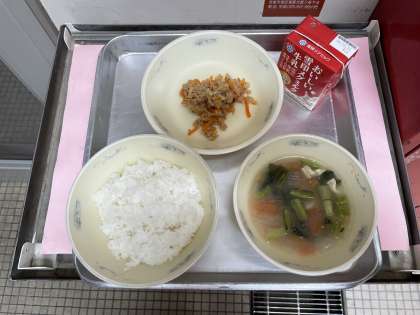 今日の給食は、ごはん、牛乳、ツナそぼろ丼(具)、トマトだご汁でした。