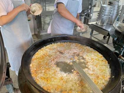 給食では、だごにつぶしたホールトマトを練りこみ、生のトマトを具として入れ、トマトだご汁として提供しました。