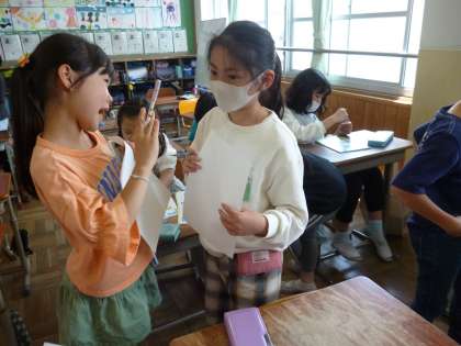 前回の学習で,様々な国の挨拶を知り,「言葉っていろいろあっておもしろいな」と感じられた子どもたち。今日は「Hello.I am〜」と,名前をお互いに英語で言い合いました。少し恥ずかしそうにしていた子もいましたが,お友達に伝わったときはうれしそうな笑顔が見られました。