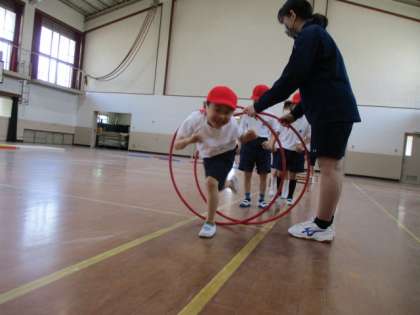 今日から、チャレンジ体験の中学生が来てくれています。体育の「まねっこあそび」の学習では、前の人の動きをまねしながら、コースを駆け抜けていきました。中学生のお姉さん先生に、フラフープを持ってもらいました。コースの難易度がだんだん上がっていき、楽しんで運動することができました。