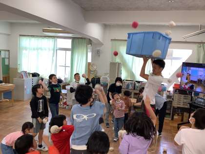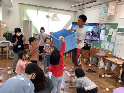 祥豊小学校との交流遊びの二つ目は,みんな大好きな,動く玉入れ。