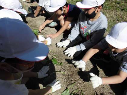 サツマイモの苗をうえました。おいしく育ちますようにと優しく土をかけていました。