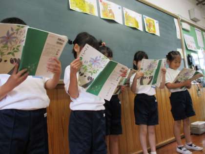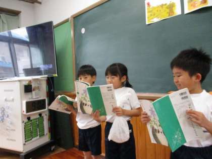 国語の「はなのみち」の学習では、音読発表の練習をしています。教科書には書いていないセリフを考え、なりきって音読している子もいました。