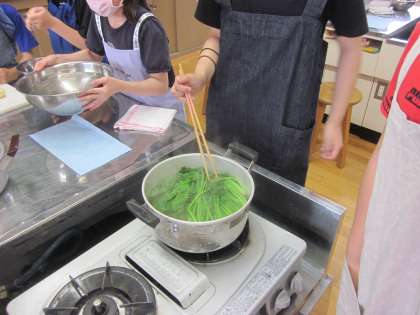 初めての調理実習は「ゆでる」調理の学習です。ほうれん草とじゃがいもを茹でました。水からゆでるのか,お湯からゆでるのか,どれくらいの時間ゆでるのかなど,気をつけることがたくさんです。