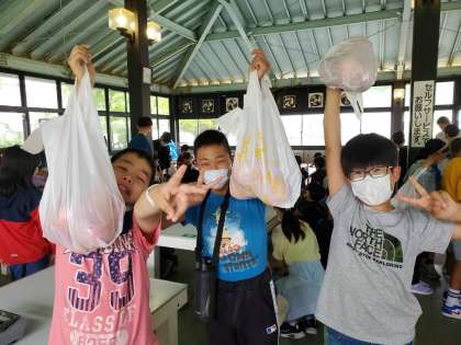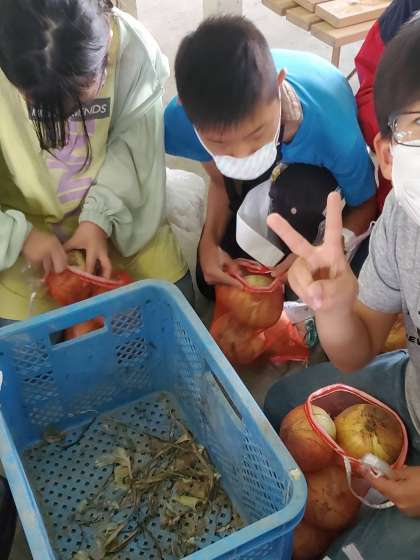かわりに,どれだけたくさんネットに玉ねぎを詰められるかに燃える子どもたち。