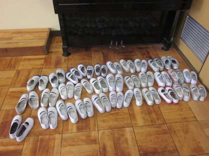 音楽室へは上靴を脱いで入ります。みんなの上靴がそろっているととても気持ちがいいです。授業に向かう準備がしっかりできているといえます。そろえてくれている子もいるようです。気遣いが素晴らしいですね。そして,美しい歌声が出せるように腹筋のトレーニングも行います。寝転んで足を上げておなかを使って声を出します。慣れてきたら,立って歌うことが楽しくなってきそうですね。