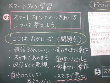 情報モラル市民インストラクターの方に協力してもらい,情報モラル教室を行いました。めあては「スマートフォンとのつきあい方について考えよう」です。まずは,動画を見て,動画に出てくる内容の問題点について意見を出し合いました。子どもたちにとっては身近な問題のようで,活発に意見が出ました。