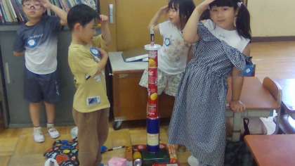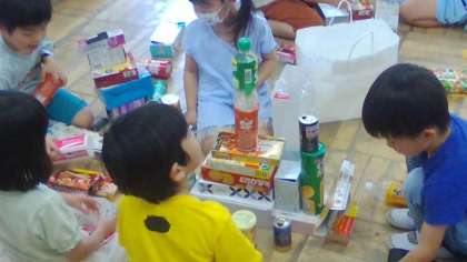 図画工作の学習で、箱などの材料を使って造形遊びをしました。縦に積んだり、並べたり、転がしたり…。算数の「はこのかたち」で学習したことを活かして、上手に学習していました。