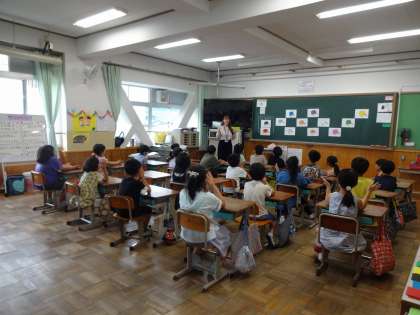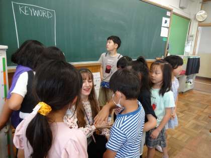 子どもたちは、ゲームを通して色や体、好きなものの言い方などに慣れ親しみました。休み時間もたくさんお話ししました。