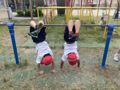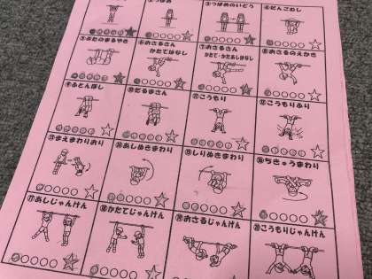 子どもたちはワークシートを見ながら,進んで「てつぼうあそび」を楽しんでいました。色々な技に挑戦する姿がたくさん見られました。