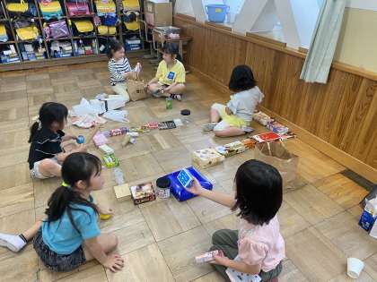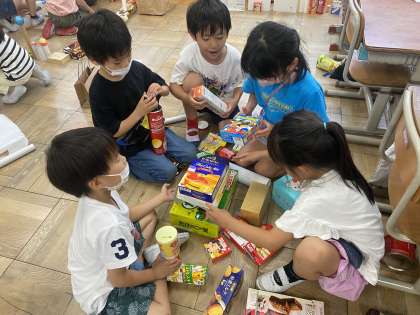 「いっぱいつかってなにしよう」では,集めて頂いた箱を使って自由に工作をしました。箱を積んで東京タワーをつくったり,箱を並べて家をつくったりしていました。初めは4〜5人で作っていたのが,どんどんグループが大きくなり,たくさんの箱を使って遊んでいました。子どもたちは試行錯誤しながら,生き生きと取り組んでいました。
