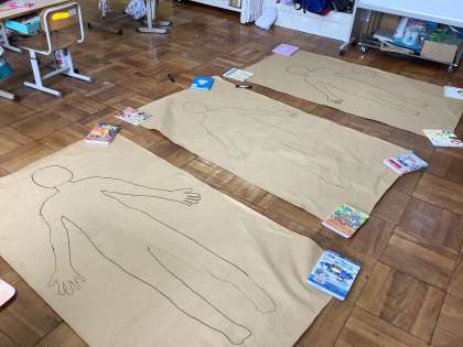 13日(火)の生単で,自分の体のシルエットを取り,体の色んなところの長さを調べました。友だちとシルエットを取り合い,長さを比べていました。