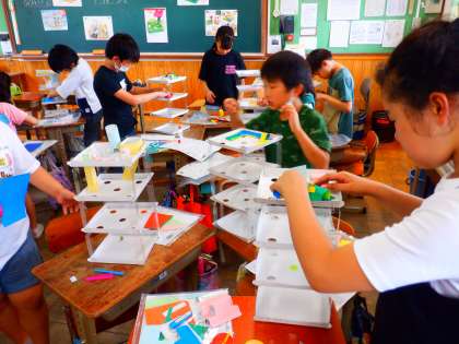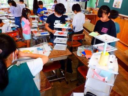 図画工作科で『コロコロガーレ』(工作)をしています。ビー玉が、転がる、止まる、落ちる、また転がる。アイデアいっぱい、みんなが転がしたくなるようコースをつくって楽しんでいます。