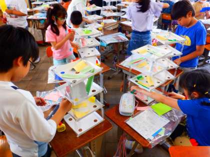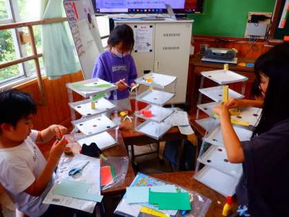 ビー玉を転がして試しながら、楽しくなるコースの形や色を考えています。つくりたいコースの感じに合う形や色を見つけ、工夫してつくっています。