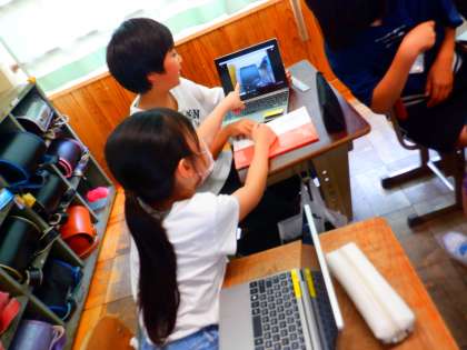 タブレットを使って写真を撮り、交流をしている様子です。国語科『アップとルーズで伝える』で学習したことをもとに、自分でも教室の中で「アップ」と「ルーズ」の写真を撮ってみました。何かを相手に伝える時には、選んだり組み合わせたりすることが大切だということを実感していました。