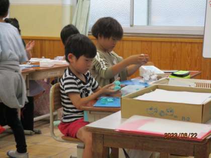 雨の日は教室で自由帳に絵を描いたり、粘土をしたりして中間休みを過ごしています。2人で何をお話ししているのかな?楽しいお話が聞こえてきそうです。
