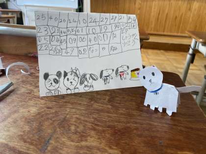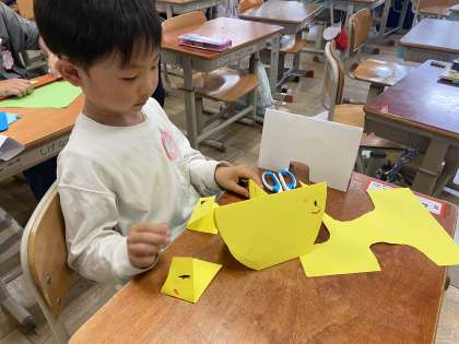 画用紙を折って立てて,自分の世界を作りました。どうやって画用紙を立てるか模索しながら,色々な方法で紙を立てていました。子どもたちの個性が出て,色々な世界ができました。
