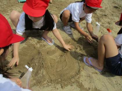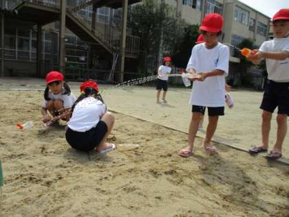 たくさん水や土で遊んで楽しみました。マヨネーズの空き容器に水を入れて、友達とどちらが遠くまでとばせるのか、勝負をしていました。3つの穴の容器と1つの穴の容器とでは、飛ぶ距離が同じだったそうです。お友達と遊んでとても楽しかったね。