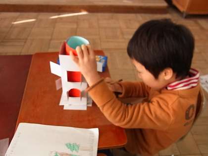 図工では,みんなの自由な発想でお城やホテル,ロケットなどを作りました。