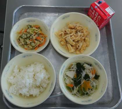 今日の給食は、ごはん、牛乳、きつね丼(具)、オクラとキャベツのごま煮、七夕そうめんでした。