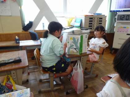 国語科では、「あったらいいな。」と思うことについて絵を描き、あったらいいなと思ったわけや、その道具を使ってできること、形や色、大きさについて考えました。その後、考えを深めるために友だちと質問をし合いました。「楽しかった!」「考えがくわしくなった!」などの感想が聞かれました。