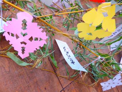 地域の方が準備してくださった笹に、それぞれの夢や願いを書いた短冊を付けました。飾りも付けて、すてきな七夕の笹が完成しました。世界の平和を願っている子もいました。