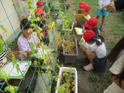 1学期から育ててきたふうせんかずらの観察をしました。「お花のあとに実ができてる!」「ふうせんをよく見たら種があるよ!」と細かいところまで見て観察をしていました。種からはじまり、また種ができたことに「花は枯れても種ができるから大丈夫。」「(いのちは)何回も続くなんてすごいな。」という感想もみられました。