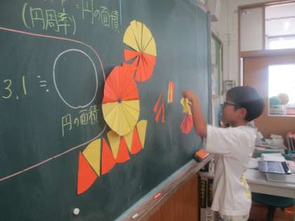 この日は,円の面積を求める公式が成り立つわけを考えました。