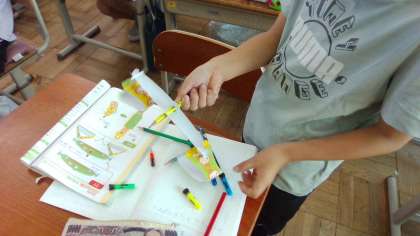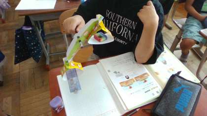 今日は手作りのてんびんを使い、文房具の重さ比べをしてみました。