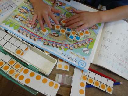 数図ブロックを使って、乗り物に乗っている人が「〇人乗りが△つ分」という言い方を学びました。かけ算マスターっ目指して頑張ります!