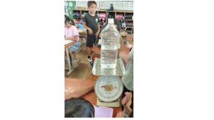 算数で、「1kgをつくる」という学習をしました。ペットボトルに1kgだと思う量の水を入れて、はかりで実際にはかりました。「もう少し増やさないと」「あれ?重すぎた」と、グループで協力しながら1kgを目指しました。1kgになったペットボトルを持って、「1kgってこんなもんなのか」「思っていたより軽いかも」と、子どもたちは感じたことを話し合いました。