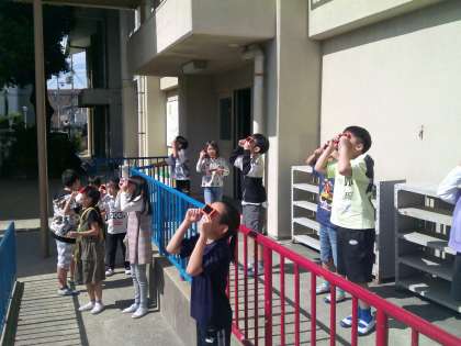 遮光板を使って、太陽を見ました。「満月みたいにまんまる!」と驚きの声が聞こえてきました。