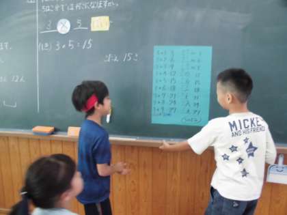 算数の九九が始まりました。2・3・5の段を学習したので教室のいろんなところに九九表を貼り、唱える練習をしました。何度も何度も唱えました。みんなとても頑張りました!