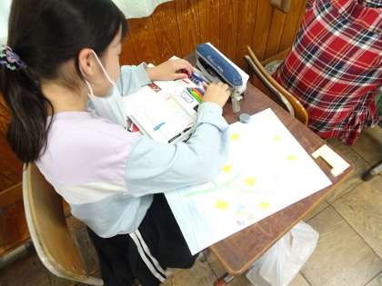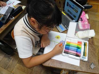 図画工作科「ほって すって 見つけて」の学習の様子です。テーマは「まぼろしの花」です。誰も見たことのない花をイメージを膨らませてスケッチしました。子どもたちは彫刻刀を使って彫るのを今から心待ちにしているようです。