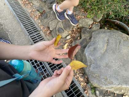 今日は生活で秋見つけに学校探検にいきました。葉っぱの色の変化や虫の変化など、たくさん秋に関係するものを見つけていました。これから授業を通して秋をたくさん感じてほしいです。