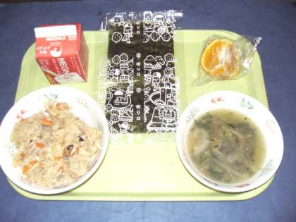 今日の給食は台風が来た時に備えて学校に保管していた缶詰や乾物を使って作りました。春雨スープにはベーコンと玉ねぎを加えてさらに旨みを出しました。