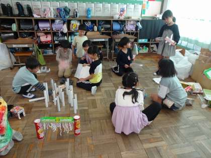 生活科の学習では、廃材を使って動くおもちゃを作りました。